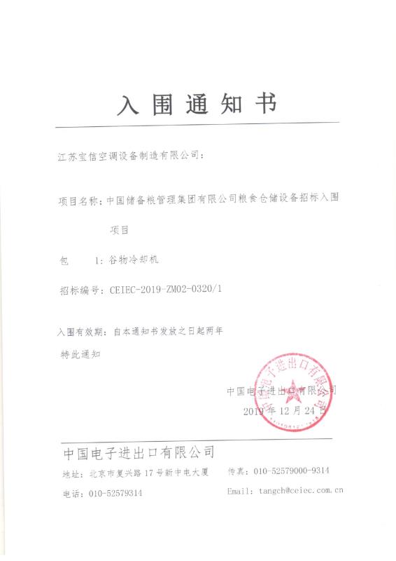 恭喜寶信空調(diào)入圍招標(biāo)中國儲備糧管理集團(tuán)有限公司糧食倉儲設(shè)備...