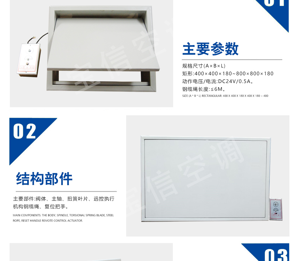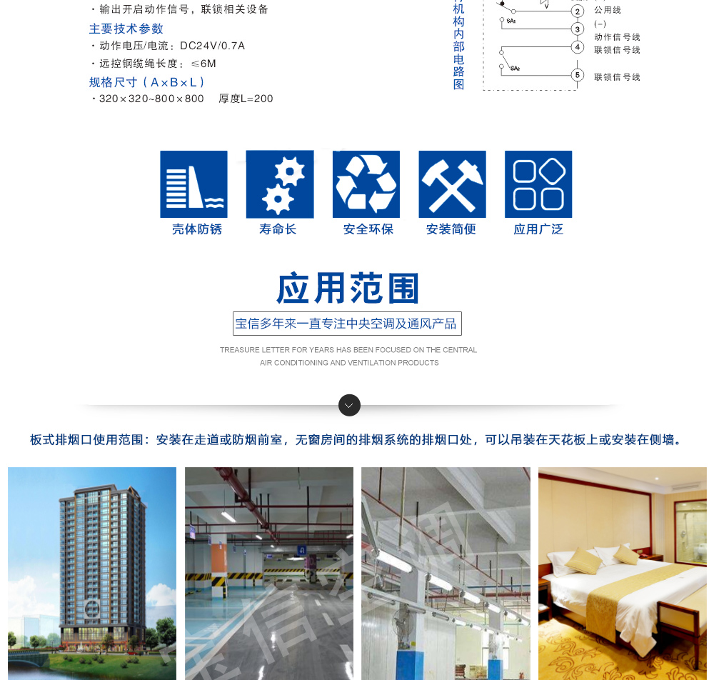 平時(shí)常閉,消控中心輸出DC24V電信號(hào),排煙口迅速開啟
