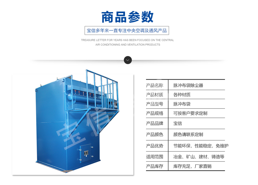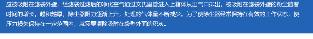 含塵空氣由除塵器底下進(jìn)入除塵器箱體中部,顆粒較粗的粉塵靠其自身重力向下沉降后落入灰倉(cāng),細(xì)小粉塵通過(guò)各種效應(yīng)被吸附在濾袋外壁,經(jīng)濾袋過(guò)濾后的凈化空氣通過(guò)文氏里管進(jìn)入上箱體從出氣口排出,被吸附在濾袋外壁的粉塵隨著時(shí)間的增長(zhǎng),越積越厚,除塵器阻力逐漸上升,處理的氣體量不斷減少。為了使除塵器經(jīng)常保持在有效的工作狀態(tài),使壓力損失保持在一定范圍內(nèi),就需要清除吸附在袋壁外面的積灰。
