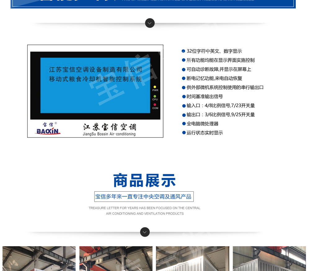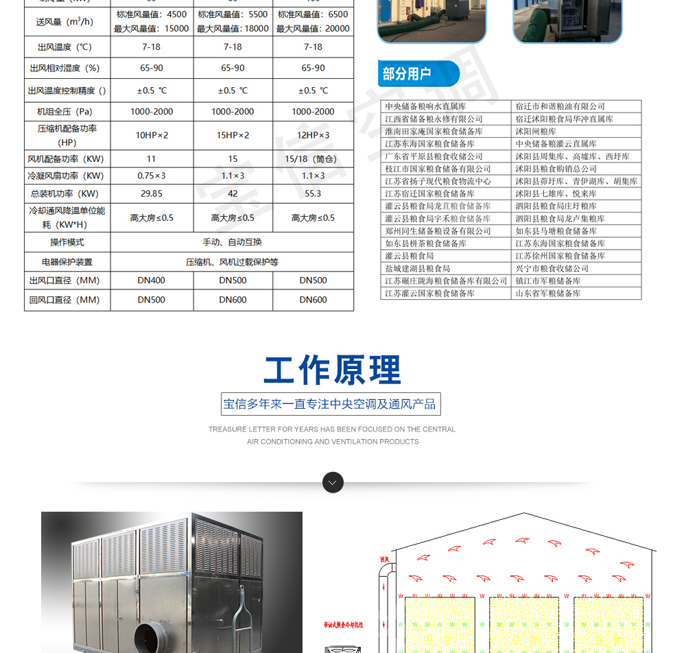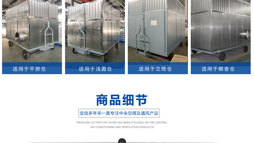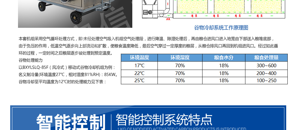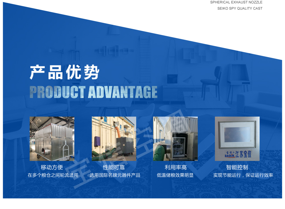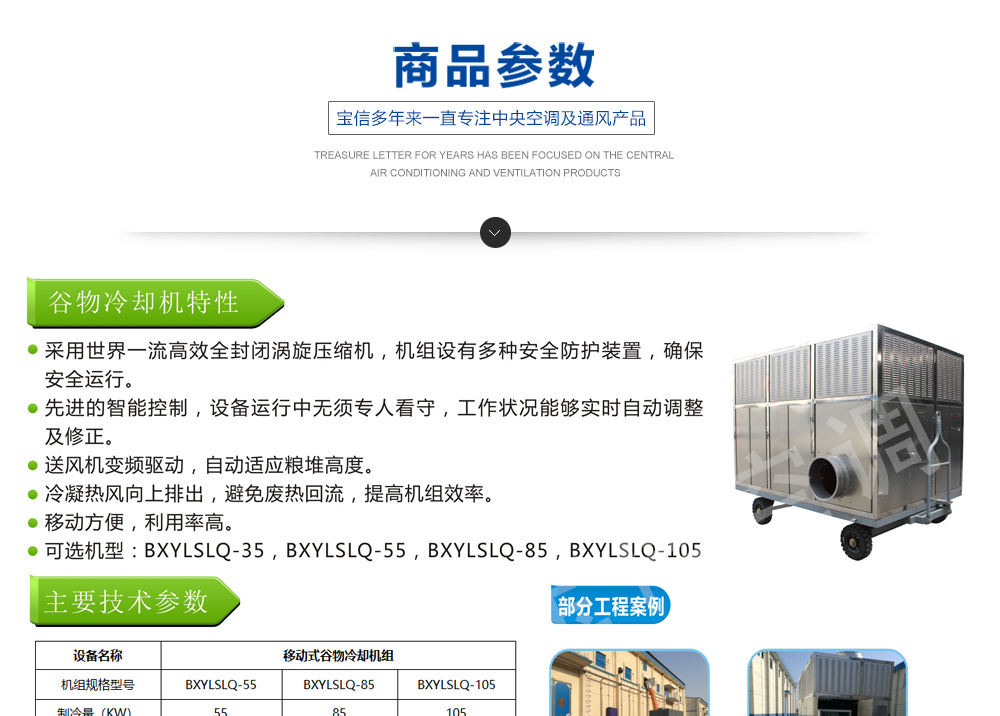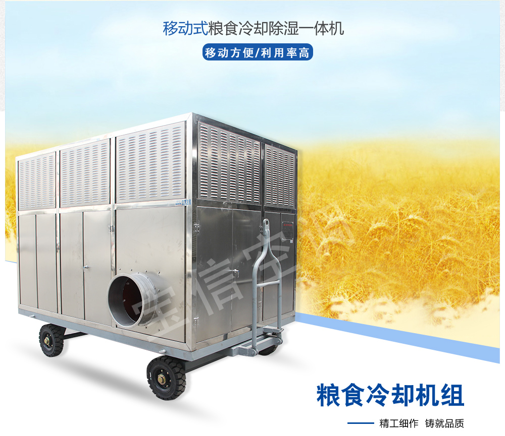 ?移動(dòng)式糧食冷卻機(jī)組主要由風(fēng)(水)冷壓縮機(jī)制冷除濕系統(tǒng),空氣循環(huán)系統(tǒng),智能控制系統(tǒng)和移動(dòng)式基座組成。該空凋設(shè)備是專門針對(duì)我國(guó)糧食倉(cāng)儲(chǔ)環(huán)境特點(diǎn)和氣候特征綜合分析而特別設(shè)計(jì)的移動(dòng)設(shè)備,是各糧食儲(chǔ)備庫(kù)實(shí)現(xiàn)綠色儲(chǔ)糧、科學(xué)保糧目標(biāo)的重要保障手段,其性能達(dá)到國(guó)內(nèi)先進(jìn)水平。該產(chǎn)品適用于:應(yīng)急處理發(fā)熱糧食、安全保存高水分糧食、優(yōu)質(zhì)稻谷的低溫儲(chǔ)存等,可用于平房倉(cāng)、淺圓倉(cāng)、立筒倉(cāng)的糧食冷卻除濕作業(yè)。