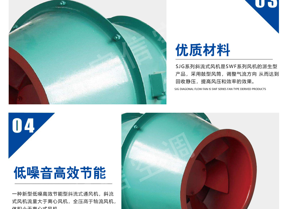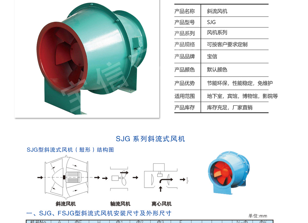SJG斜流式風(fēng)機(jī)是一種新型低噪高效節(jié)能型斜流式通風(fēng)機(jī),斜流式風(fēng)機(jī)流量大于離心風(fēng)機(jī),全壓高于軸流風(fēng)機(jī),體積小于離心式風(fēng)機(jī)。SJG系列斜流式風(fēng)機(jī)是SWF系列風(fēng)機(jī)的派生型產(chǎn)品,采用鼓型風(fēng)筒,調(diào)整氣流方向 從而達(dá)到回收靜壓,提高風(fēng)壓和效率的效果。