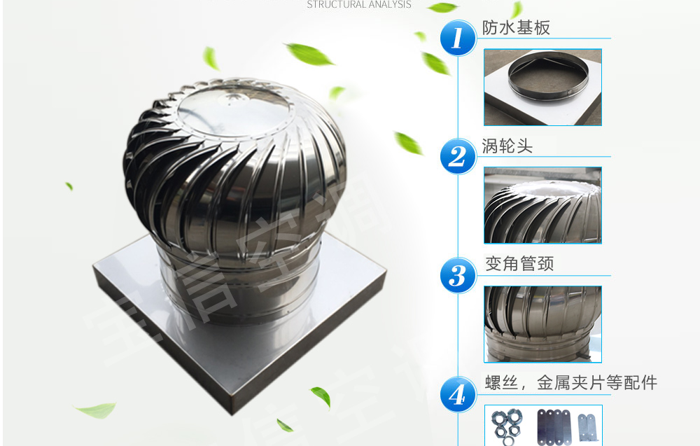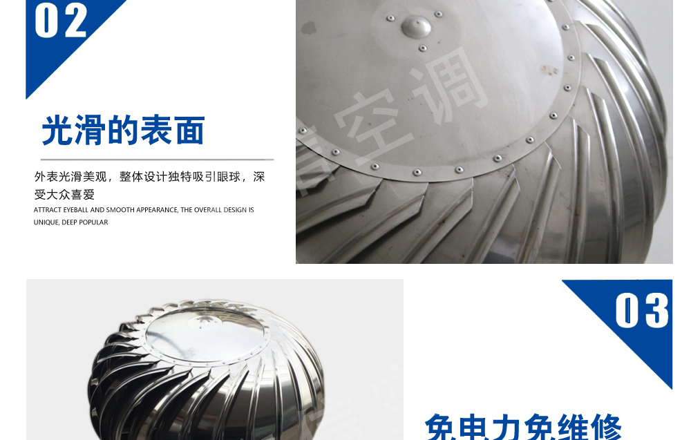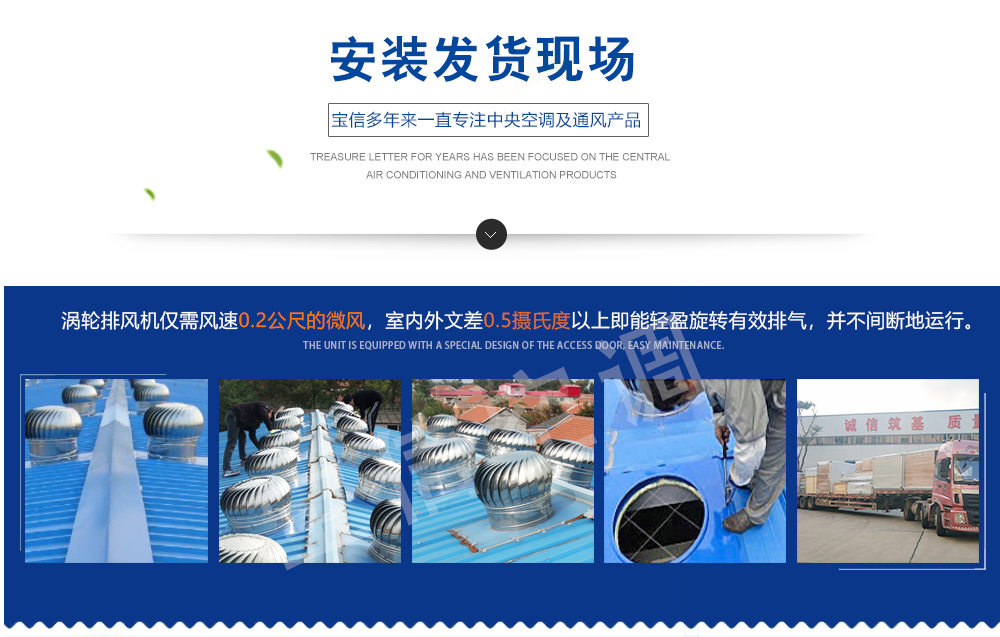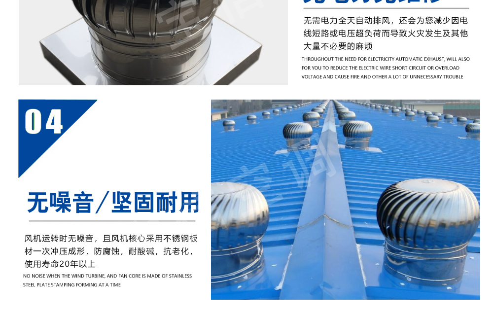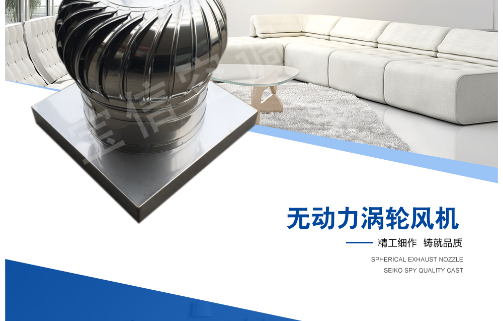 無動力風(fēng)機是利用自然界的自然風(fēng)速推動風(fēng)機的渦輪旋轉(zhuǎn),及利用室內(nèi)外空氣對流的原理,將任何平行方向的空氣流動,加速并轉(zhuǎn)變?yōu)橛上露洗怪钡目諝饬鲃樱蕴岣呤覂?nèi)通風(fēng)換氣效果的一種裝置。該風(fēng)機不用電,無噪音,可長期運轉(zhuǎn)。其根據(jù)空氣自然規(guī)律和氣流流動原理,合理化設(shè)置在屋面的頂部,能迅速排出室內(nèi)的熱氣和污濁氣體,改善室內(nèi)環(huán)境。