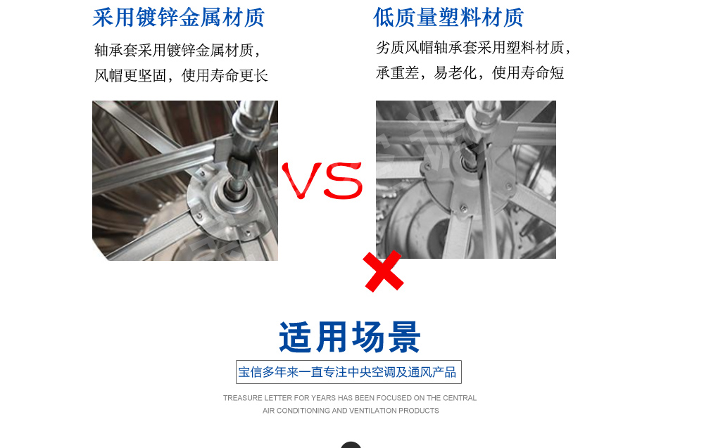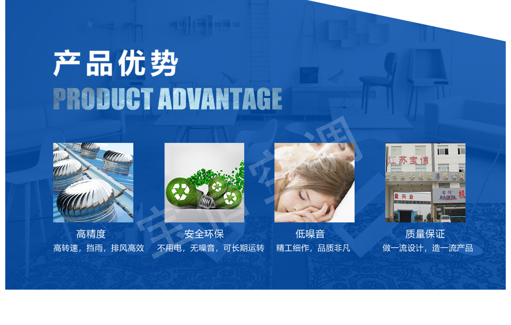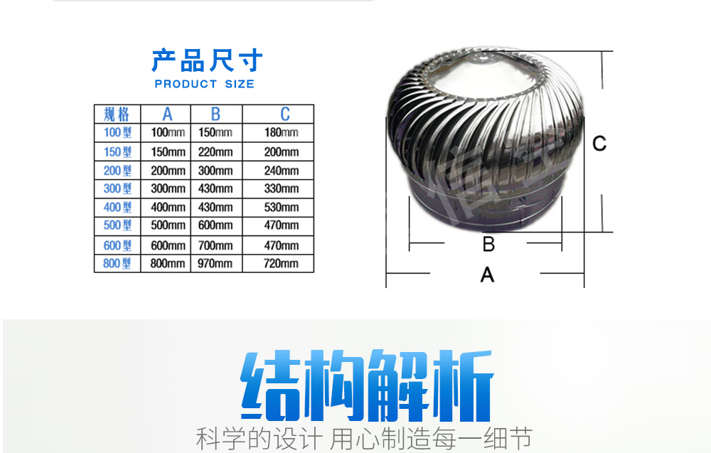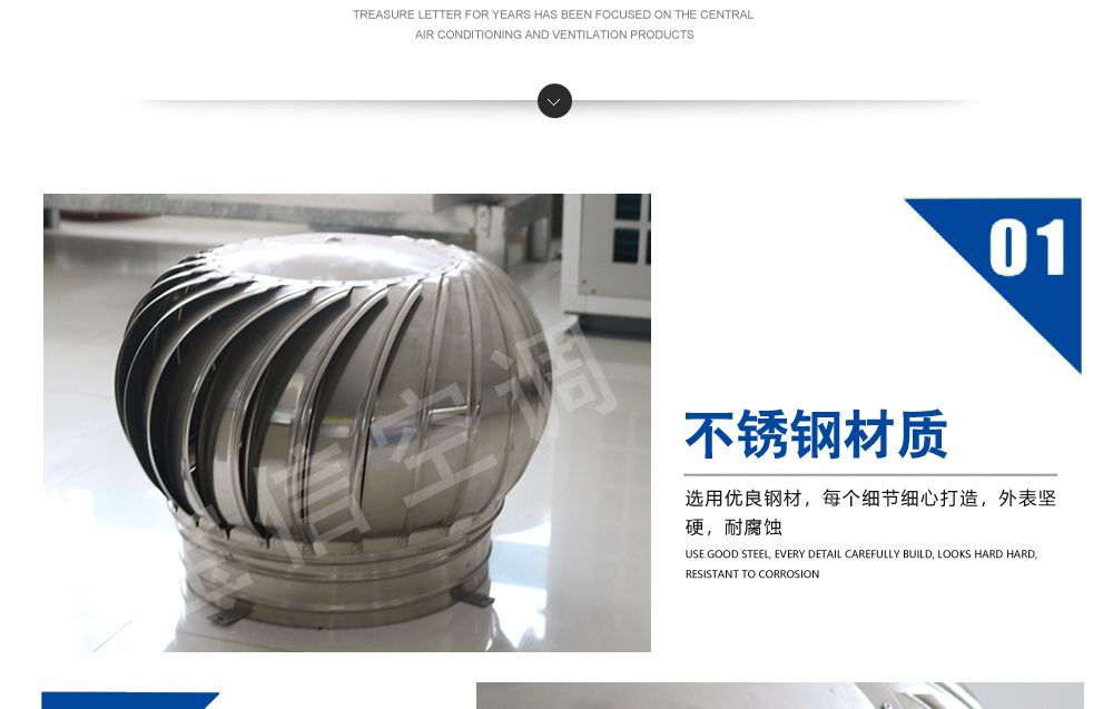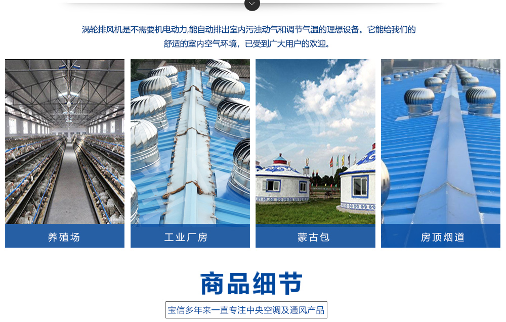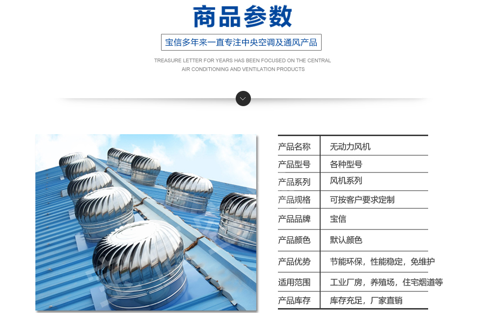 無動力風(fēng)機是利用自然界的自然風(fēng)速推動風(fēng)機的渦輪旋轉(zhuǎn),及利用室內(nèi)外空氣對流的原理,將任何平行方向的空氣流動,加速并轉(zhuǎn)變?yōu)橛上露洗怪钡目諝饬鲃樱蕴岣呤覂?nèi)通風(fēng)換氣效果的一種裝置。該風(fēng)機不用電,無噪音,可長期運轉(zhuǎn)。其根據(jù)空氣自然規(guī)律和氣流流動原理,合理化設(shè)置在屋面的頂部,能迅速排出室內(nèi)的熱氣和污濁氣體,改善室內(nèi)環(huán)境。